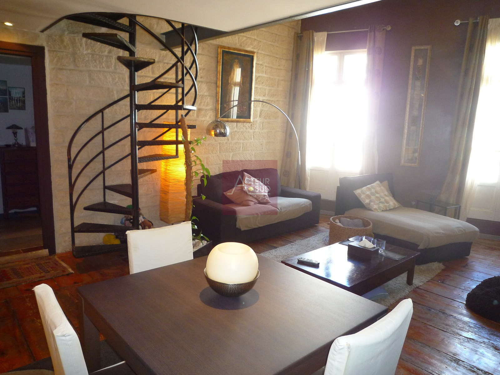 PRODUIT VENDU! Rare! Très bel appartement 4 pièces en duplex dernier étage 95m² hab, grand séjour avec très beaux volumes, cuisine équipée, superbes sols anciens en parquet et bars, pierres et poutres apparentes. Beaucoup de charme! A saisir! Classe énergie : C