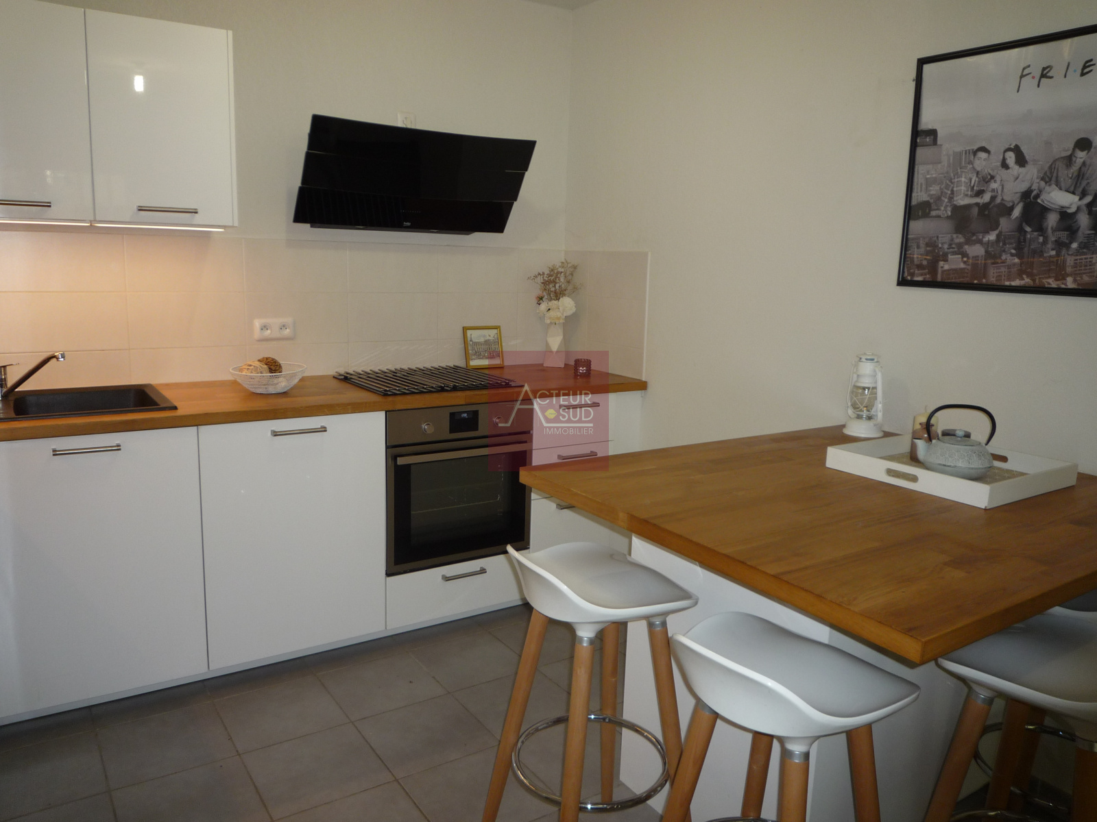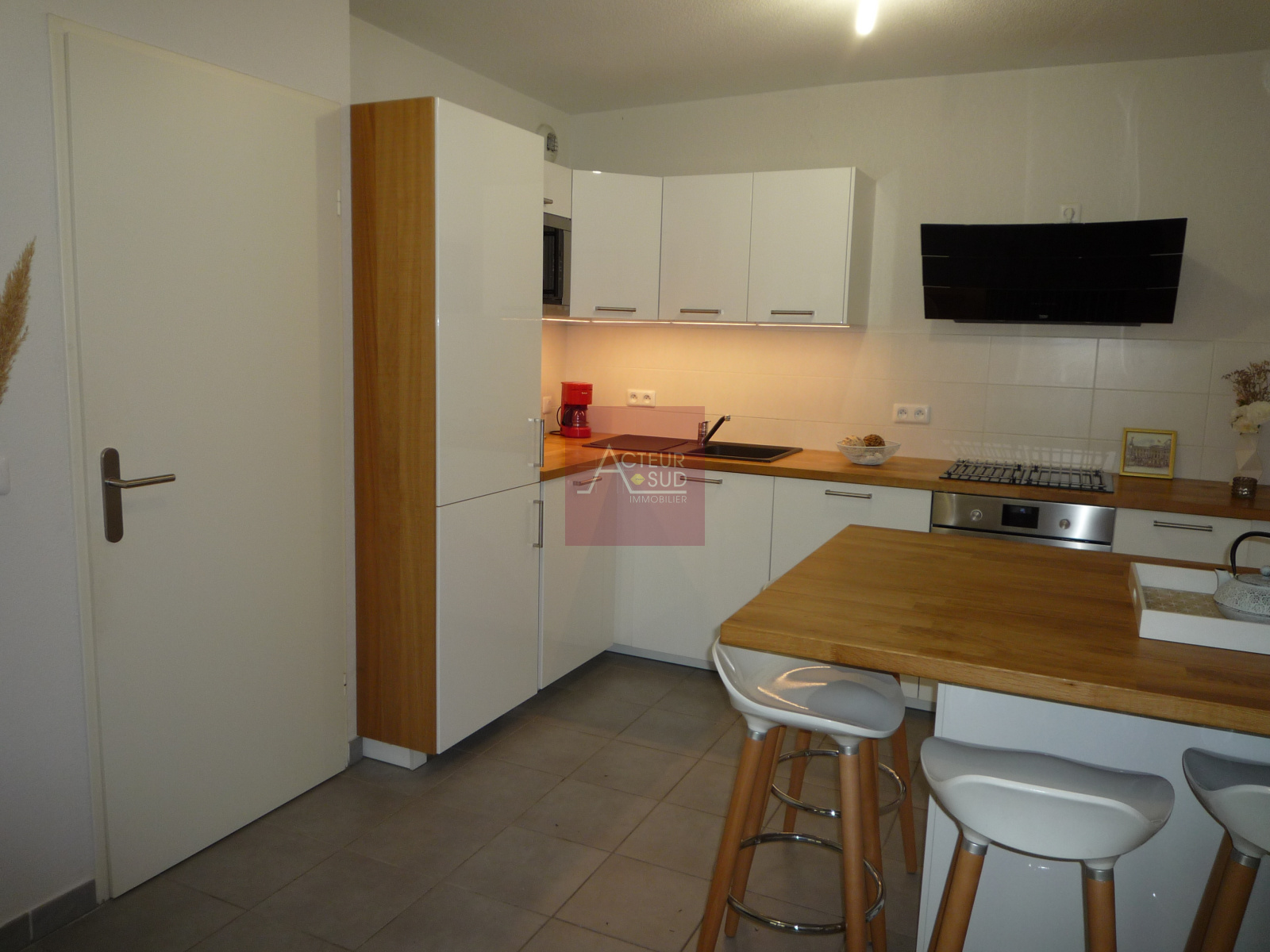 Exposition Sud, très bon état, sol : carrelage, accès terrasse et jardin 32 m², cuisine équipée avec meubles H et B + E : LL, LV, plaque, four, hotte et mo. (hors tabourets)